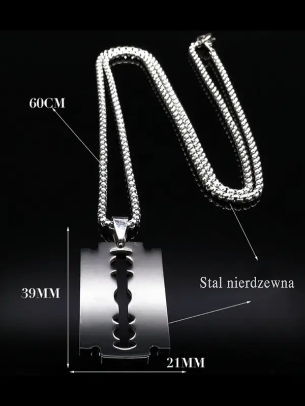 Wykonany z porządnej jakości stali nierdzewnej, naszyjnik jest trwały i odporny na działanie czynników zewnętrznych. To znakomity przykład połączenia męskiego szyku z nowoczesnym stylem. Zawieszka w formie żylety jest nie tylko estetycznym elementem, ale także wyrazem Twojego indywidualizmu i niekonwencjonalnego podejścia do mody.