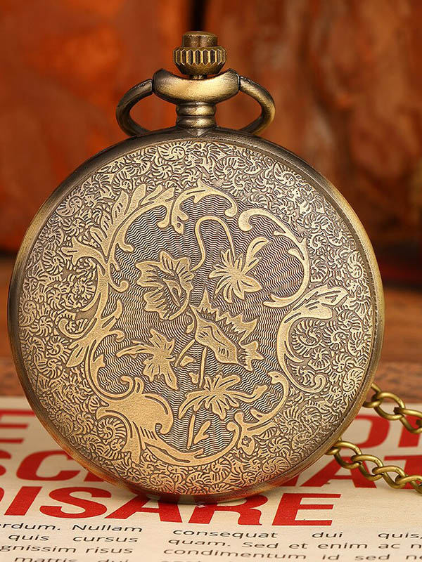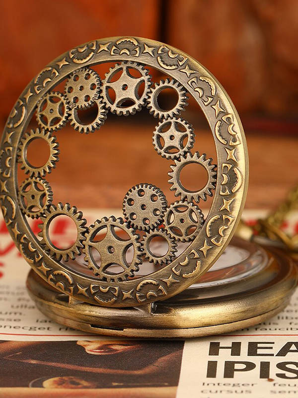 Piękny zegarek kieszeniowy retro w kolorze mosiądzu, na łańcuszku, z motywem kółek zębatych i dodatkową ozdobą. Rzeźbiony front jak i tył, biały cyferblat.