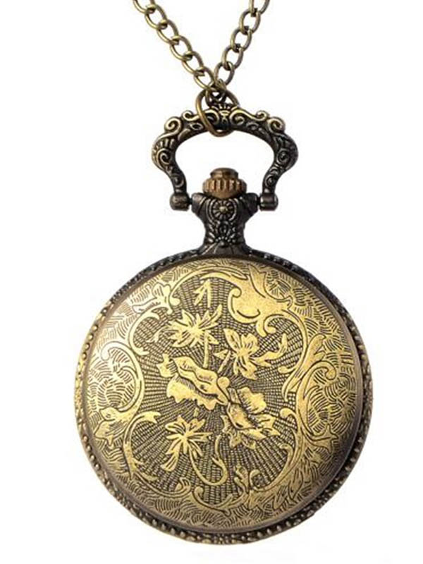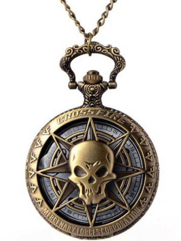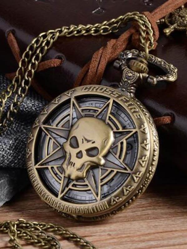 Inspirujący zegarek kieszeniowy retro w kolorze mosiądzu, na łańcuszku, z motywem czaszki.